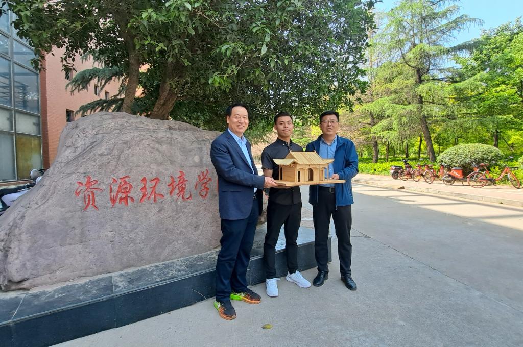 2022届毕业生代表韩磊向学院赠送了以学校西门为原型的手工艺品,学院领导罗绍河、孙付伟代表学院共同接收这份礼物。