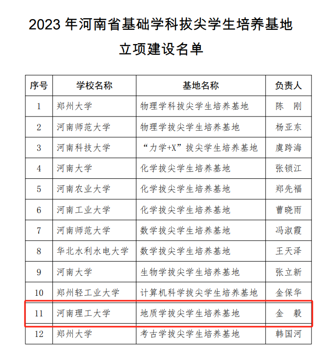 近日,河南省教育厅发布了《关于2023年河南省基础学科拔尖学生培养基地立项建设名单的公示》,资环学院申报的“地质学拔尖学生培养基地”获批立项建设。据了解,河南省共立项建设12个基础学科拔尖学生培养基地,建设周期五年。