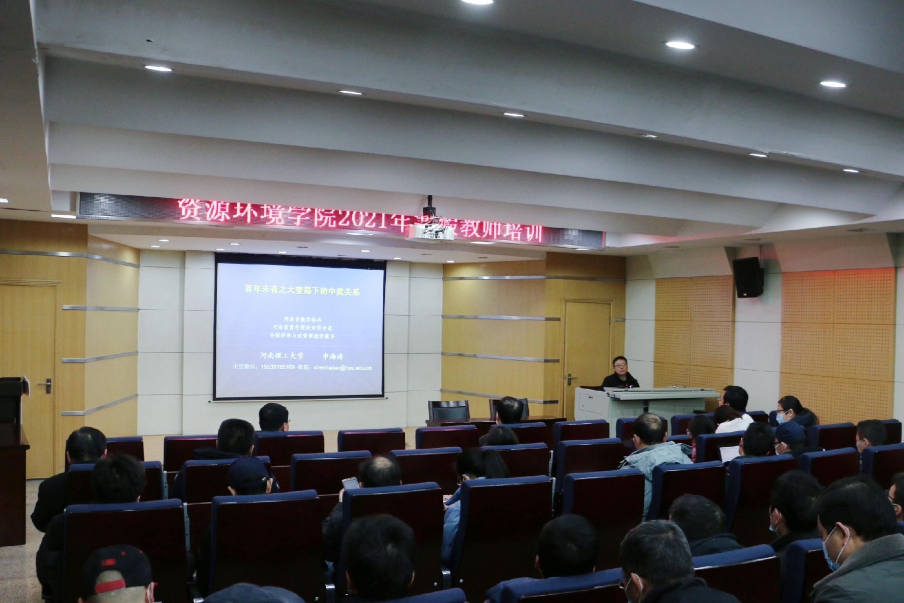 教师展开热烈讨论与深刻交流;11日下午,马克思主义学院申海涛作了题为《百年未有之大变局之下的中美关系》的报告,慷慨激昂、幽默风趣、深入浅出的为大家带来了一场知识盛宴;12日由各系室主任主持开展研讨会,认真组织思考规划“十四五”期间各专业、学科和学位点的建设与发展;并开展线上培训,学习了《高等教育发展趋势》、《党的十九大及全国教育大会精神解读》、《课程思政与优质课程建设——如何打造课程思政线上线下精品课》等内容。大家纷纷表示本次培训内容实用性强,受益匪浅。