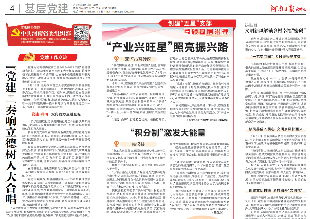 资环学院资勘系党支部按照新时代党建要求,以建设中国特色世界一流的地质资源与地质工程学科为目标,探索建立起以立德树人为核心,以一流学科建设和一流本科建设为两翼的党建工作体系,走出了一条“‘党建+’奏响立德树人”高校党建特色之路,受到河南日报客户端、”学习强国”学习平台、河南日报农村版等主流媒体广泛报道,党支部三级联创相关活动受到河南省科学技术协会、焦作市科学技术协会、焦作晚报、焦作日报教育之声视频号等媒体报道,引发热烈反响。相关内容如下:
