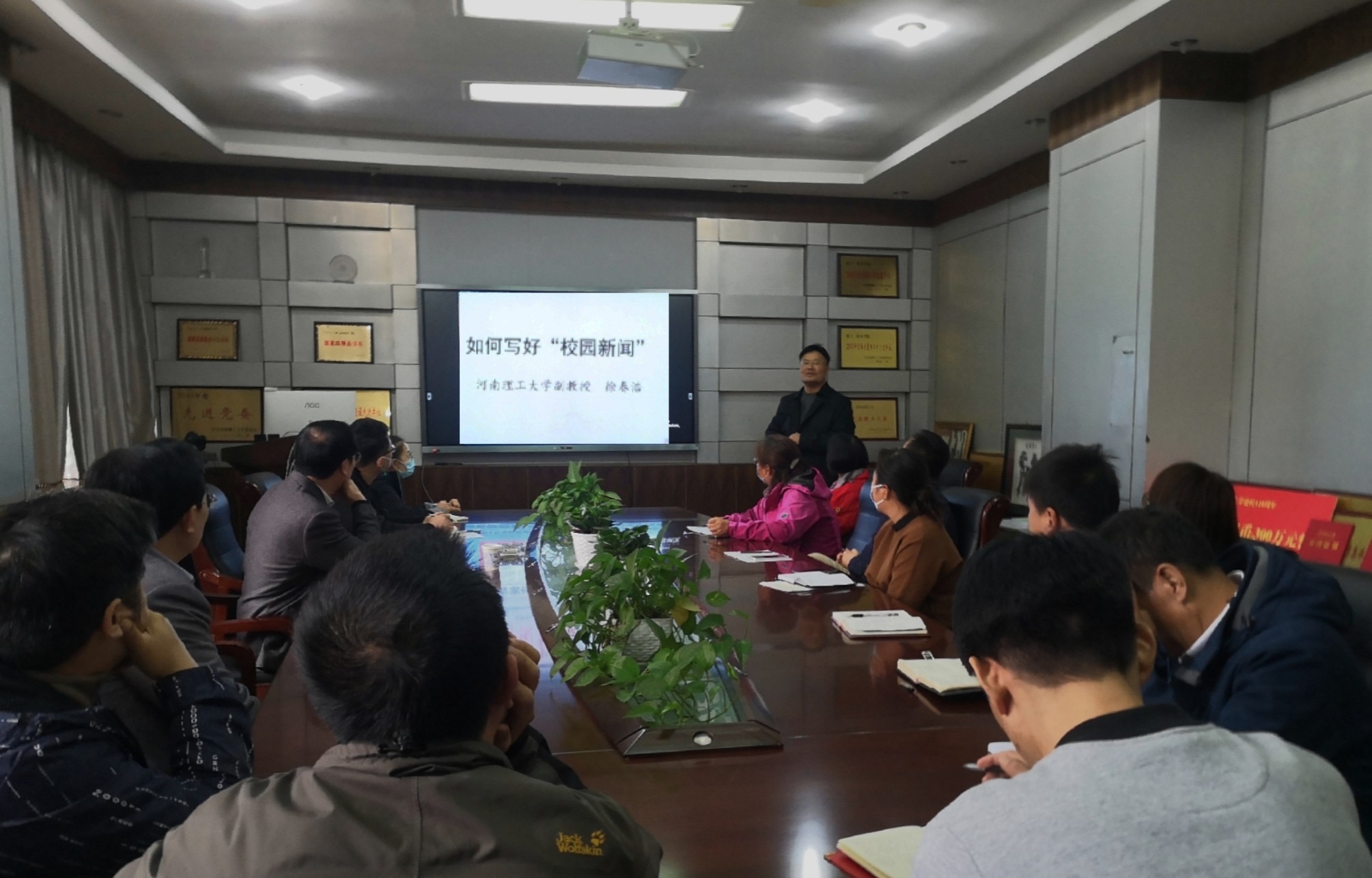 师生掌握新闻写作技巧,提高新闻写作能力,进一步做好新闻宣传工作,10月27日下午,校宣传部新闻宣传科科长徐春浩副教授应邀在资环楼二楼会议室作题为《如何写好“校园新闻”》的专题讲座。学院党委书记罗绍河、副书记许传阳、各党支部书记、全体辅导员以及团委宣传中心部分成员参会,会议由许传阳主持。
