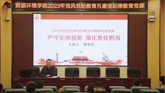 党委书记桑俊勇在学院1号学术报告厅为全体教职工讲授《严守纪律规矩 强化责任担当》廉洁纪律教育党课。