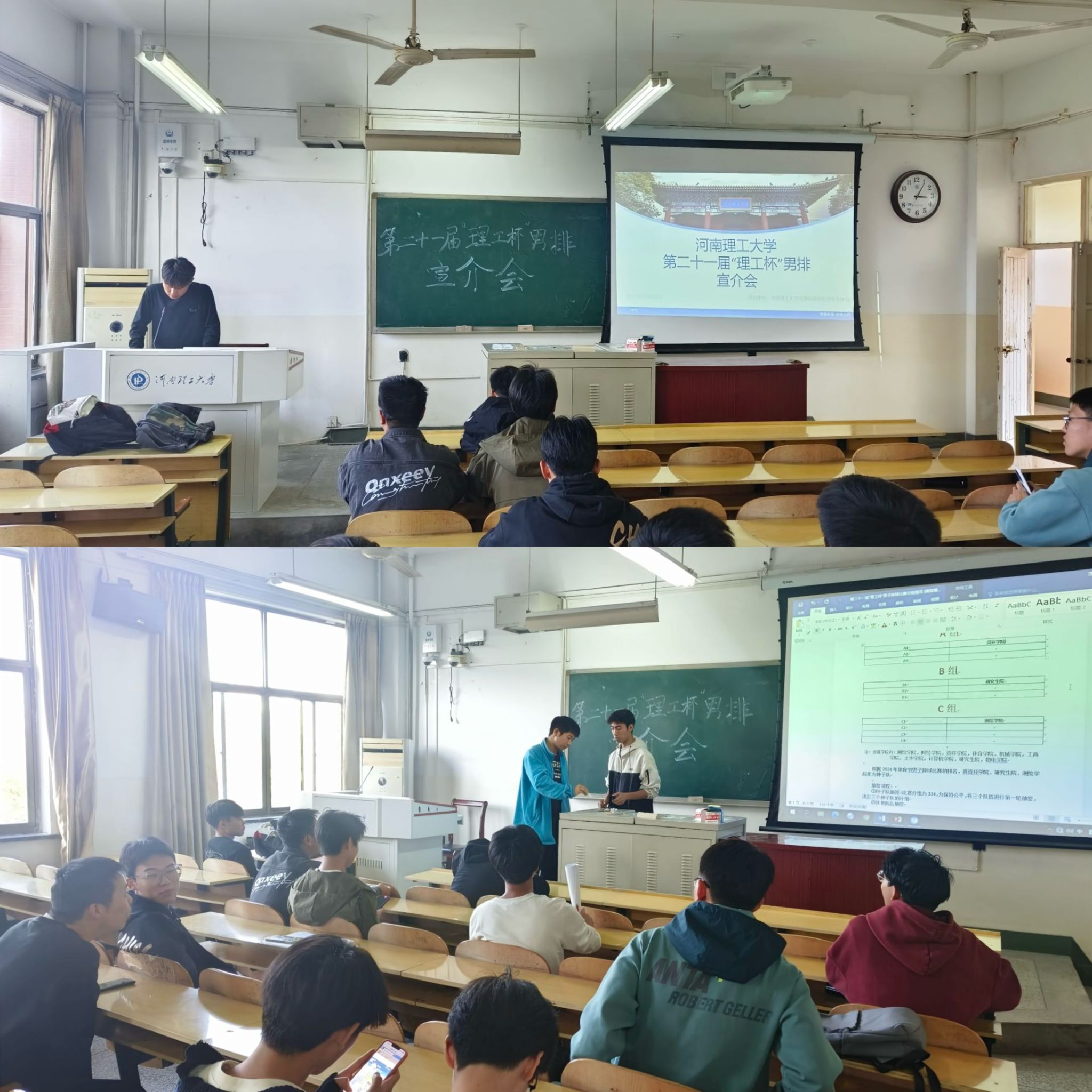 承办,校大学生排球协会协办的河南理工大学第二十一届“理工杯”男子排球比赛的宣介会在资环楼402举行,各学院的男排参赛队伍代表参加了此次会议。