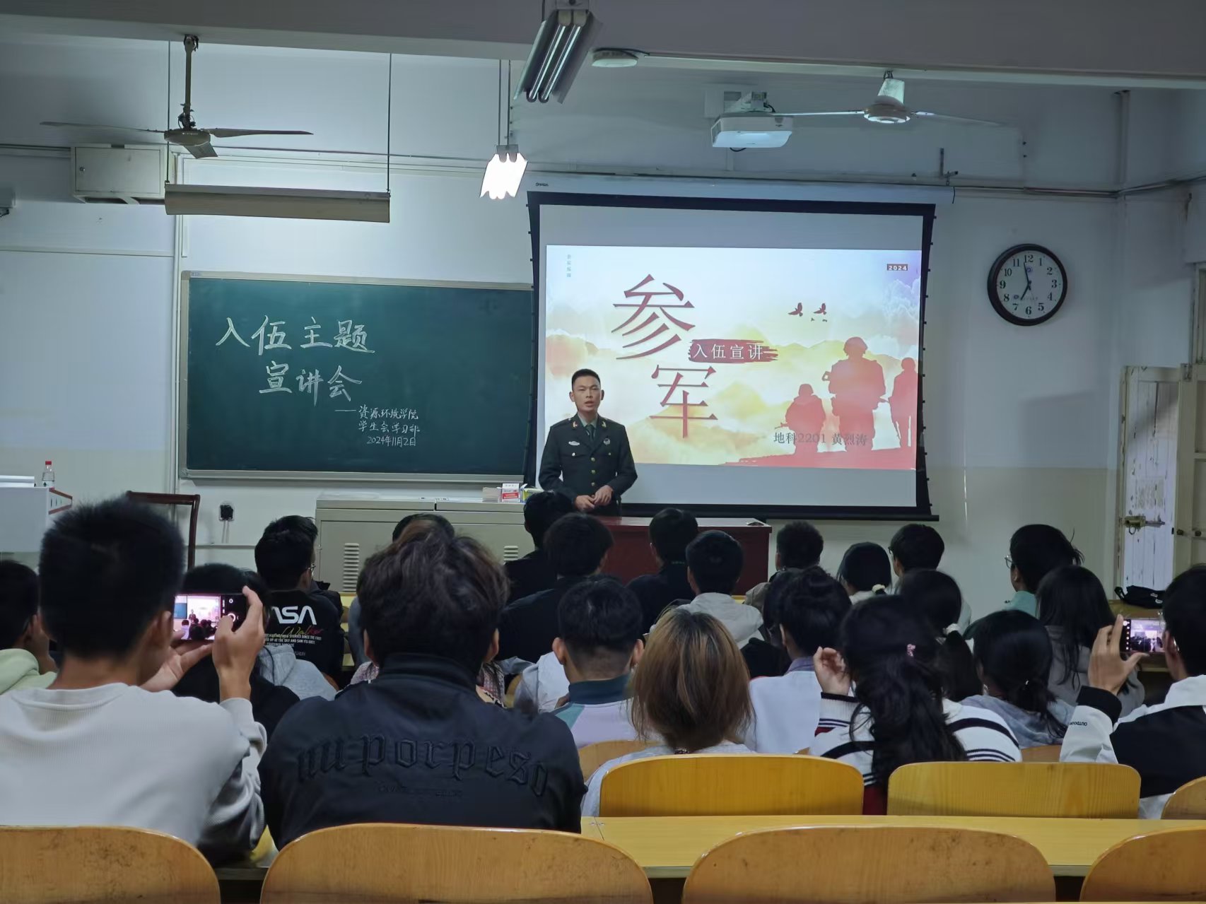 学生会学习部在资环楼402开展以“携笔从戎,无悔青春”为主题的应征入伍政策宣讲会,并邀请退伍军人学生代表黄烈涛为同学们宣讲。