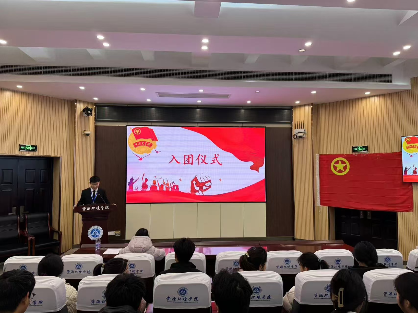 于资环楼第I学术报告厅举办新团员入团仪式。院团委副书记王梦利、24级辅导员杨澳伟、全体新入团团员和部分老团员代表参加了会议。