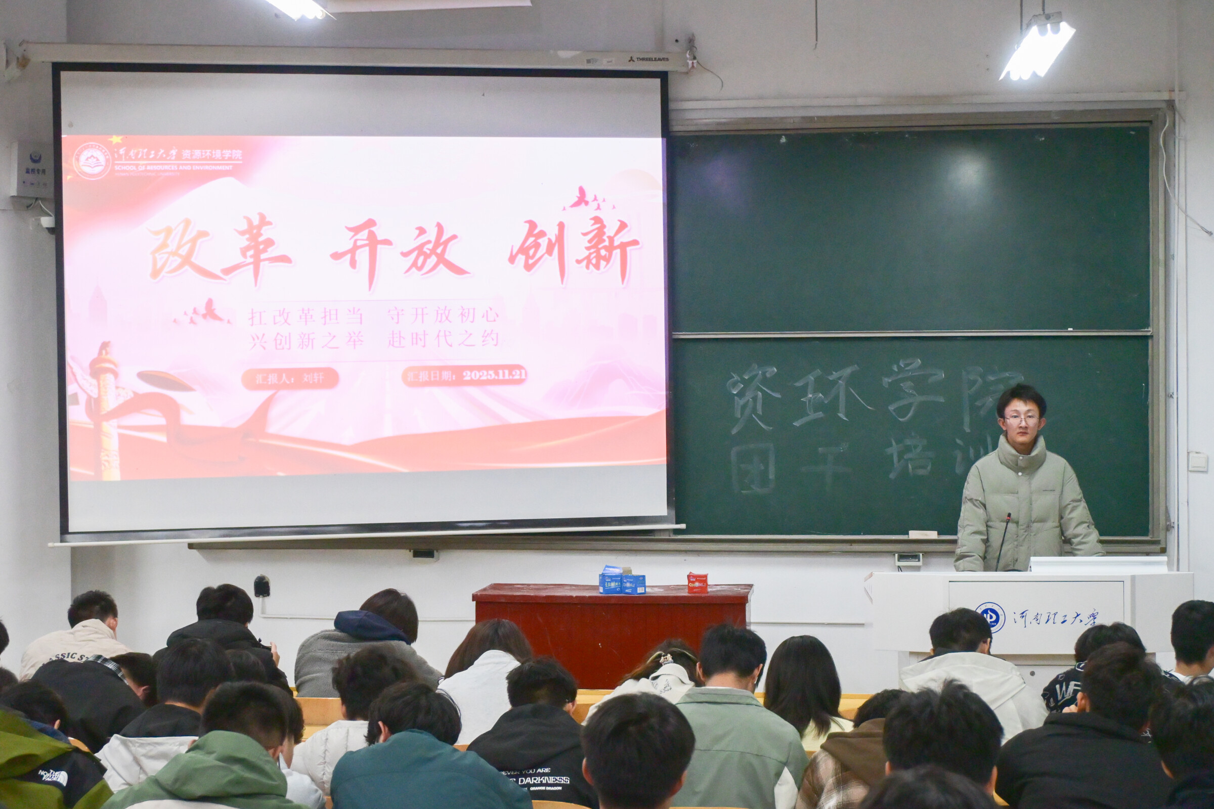 科创中心联合院学生会于资环楼104教室举办“改革 开放 创新:扛改革担当,守开放初心,兴创新之举,赴时代之约”主题培训。本次培训由优秀学生代表刘轩主讲。