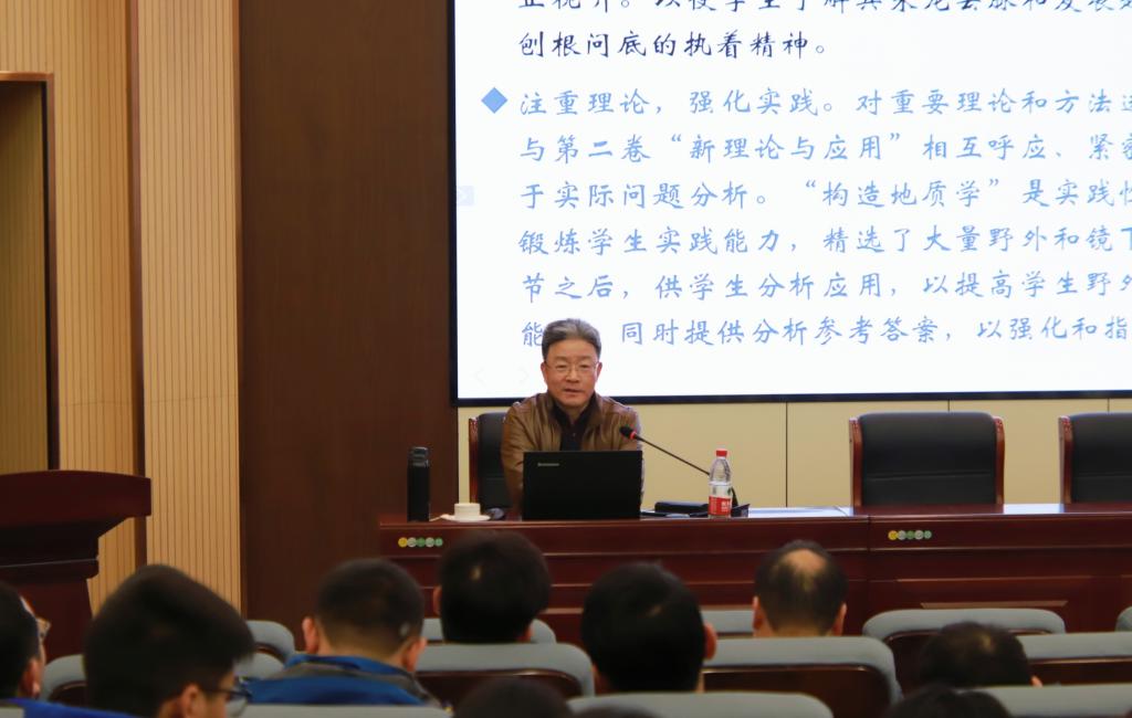 报告会上,侯教授指出教材研读是学生学习、掌握科学知识与技能的重要途径,更是研究生系统学习专业本领、从事科学研究的关键渠道;随后,结合几十年的教学科研实践与感悟,详细讲解了《高等构造地质学》系列教材从布局、讨论到落笔编写的全过程;最后,侯教授探讨了如何从构造地质学经典理论中发现新的科学问题,鼓励科研工作者培养学术研究的科学精神、理性思维和奋斗不息的品质,努力实现科教融合和立德树人。讲座引起了在场教师及全体研究生的热烈反响和广泛认可,大家纷纷表示这次讲座加深了对教材编撰及科学研究的了解和认识。