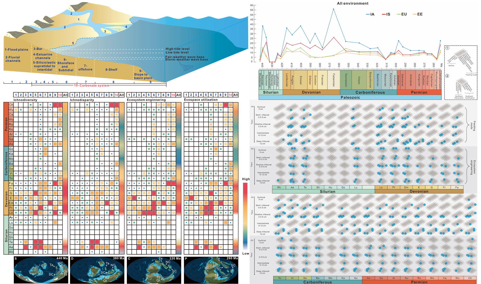 张立军教授团队联合国内学者,通过对中国主要构造板块的中–晚古生代(志留纪–二叠纪)地层中赋存的遗迹化石及其反映的古生物学、古生态学和古气候学等进行了系统综合研究,首次揭示了底栖动物对于古生代植物陆地化进程的响应机制,并勾画出底栖动物的行为策略、生态位扩张及生态系统工程重建的完整图景。张立军教授为论文第一作者和通讯作者,该研究得到国家自然科学基金(42472037)、河南省自然科学基金重点项目(252300421289)、河南理工大学创新型科技创新团队(T2022-5)等项目资助。